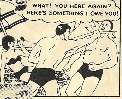 Charles Atlas is probably best remembered today for the wildly popular, full-page comic book advertisements for his eponymous body-building course. The story line in the ads hardly changed over the decades: a scrawny, dweeby-looking young man (typically named “Mac,” “Joe”, or “Jack”), dressed in ill-fitting, high-waisted swim trunks, sits with his shapely girlfriend on a beach towel, when, seemingly out of nowhere, a macho bully insults him (“Hey skinny! Yer ribs are showing!”), slaps him, and then kicks sand in his face, while Joe’s girlfriend snickers and further deflates his ego (“Oh, don’t let it bother you, little boy!”). Joe stomps angrily home, kicks a chair, vows revenge, then sends in a coupon for a free Charles Atlas booklet, and –lo!–two panels later he’s back on the beach with muscles popping out all over the place, bopping the bully in the jaw to the lusty approval of his fickle girlfriend (“Oh, Joe!” she coos as the bully skulks away. “You are a real he-man after all!”)