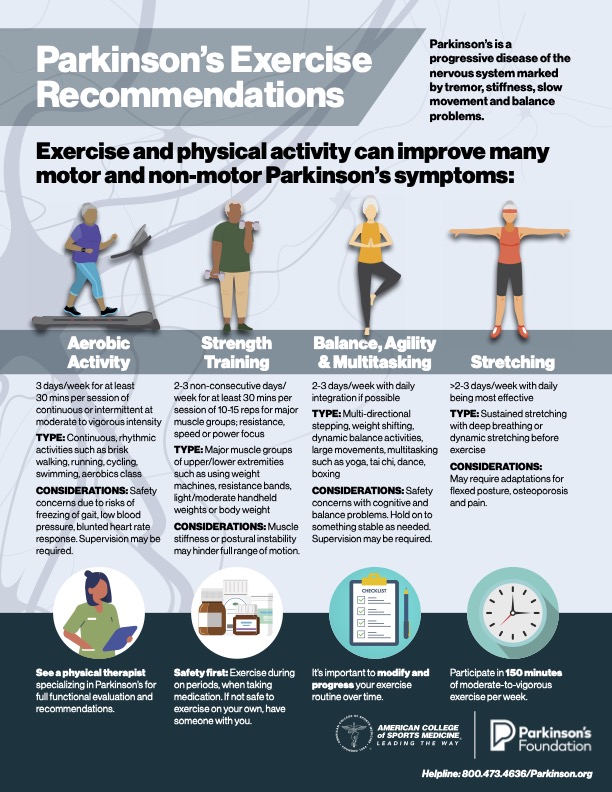 American College of Sports Medicine (with the Parkinson’s Foundation): Exercise Guidelines for Parkinson’s (A more in-depth look at the benefits of exercise.)