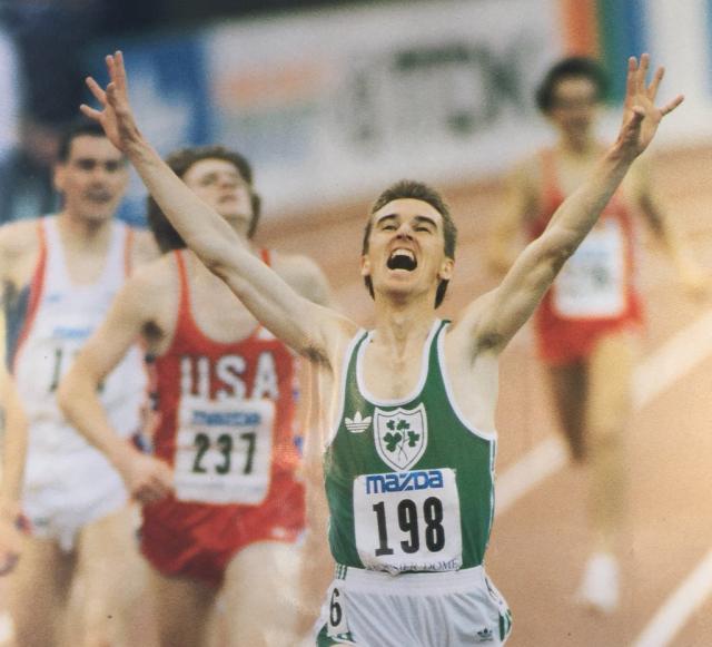 O’Mara, winning the 3000-meter Indoor World Championship gold medal in 1987.