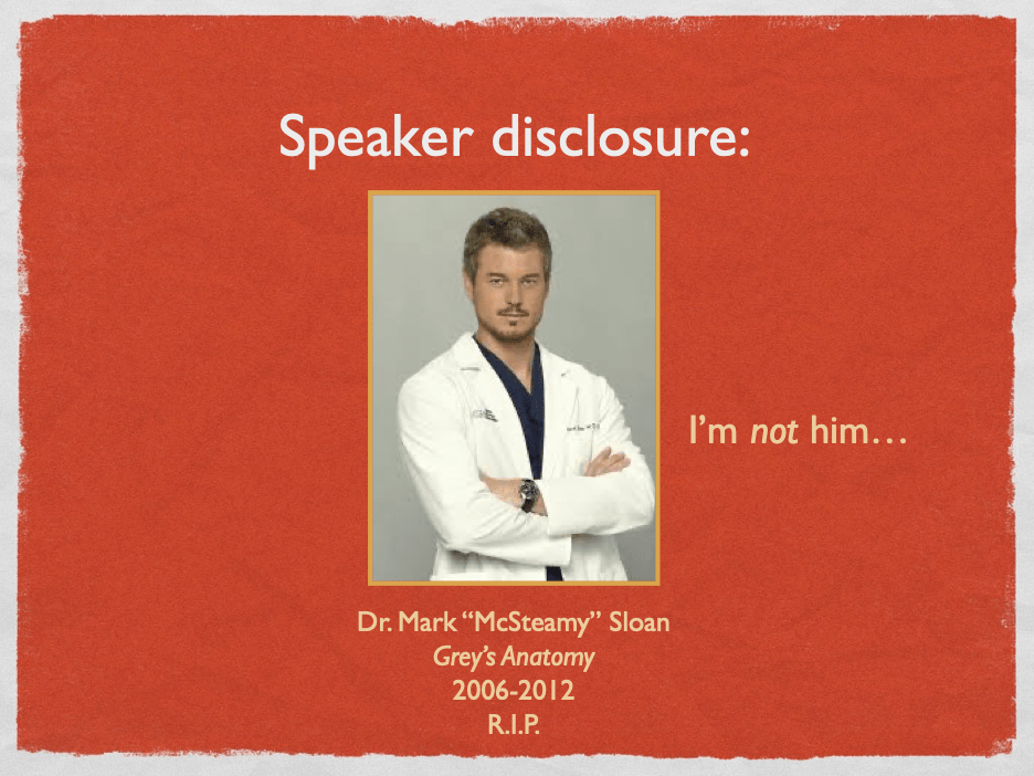 I discovered that the key to winning over audiences — and boosting my confidence in the bargain — was to hit them early in the presentation with humor. My go-to Powerpoint icebreaker was a “speaker disclosure” slide that was simply a picture of Dr. Mark “McSteamy” Sloan, the hunky plastic surgeon on the TV show Grey’s Anatomy, with my “disclosure” (“I’m not him…”) typed next to McSteamy’s left bicep.