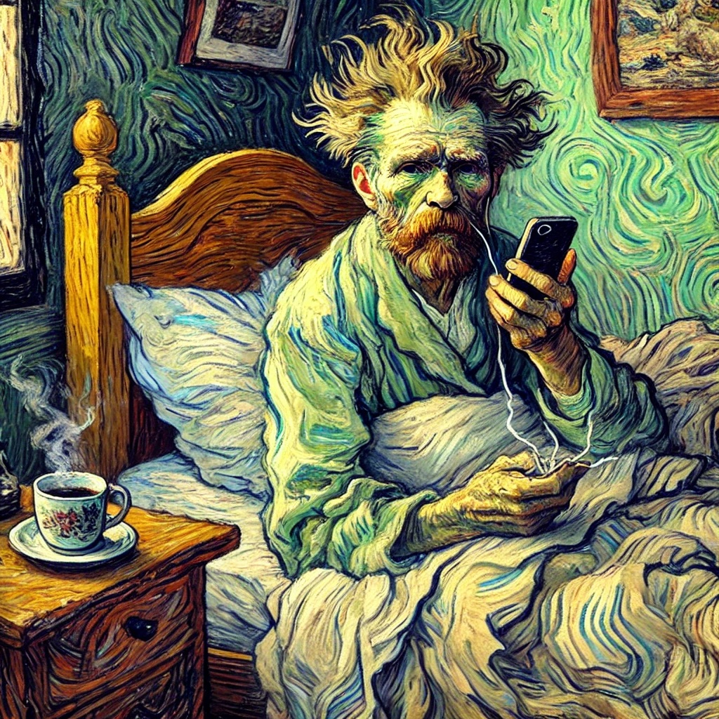 2. No, that’s not me in the picture — it’s my AI-guided image of a cranky old man with bed-head, holding a coffee cup and an iPhone, done up in the style of Van Gogh. (So, maybe it’s me after all…).